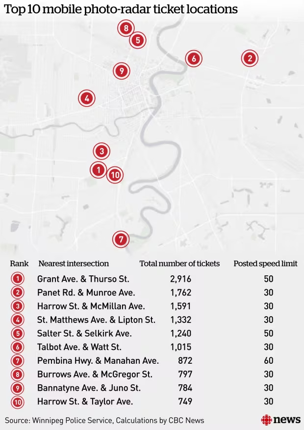 A CBC News analysis of 22,737 mobile photo-radar tickets handed out over a four-month period in 2016 found the City of Winnipeg dinged more motorists for speeding on Grant at Thurso than at any other location in the city, more motorists on Wednesdays than on any other day of the week, and more drivers between 4 and 5 p.m. than during any other hour.